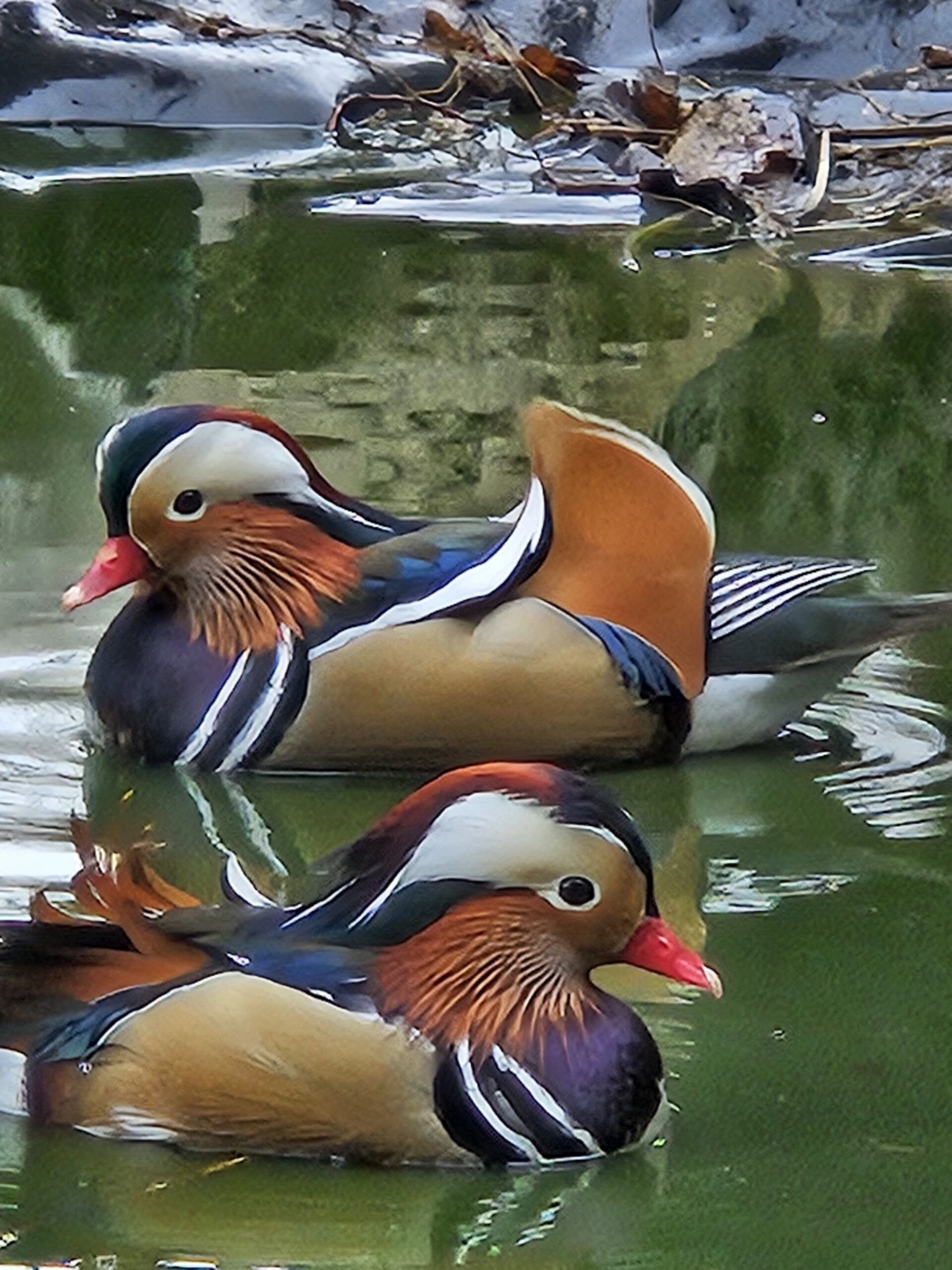 Le mâle se distingue par un plumage très décoratif, aux couleurs vives et contrastées, avec ses célèbres plumes orangées dressées sur les flancs. La femelle, plus sobre, présente une élégance naturelle et une grande finesse. Ensemble, ils constituent un couple harmonieux, idéal pour l’ornement.